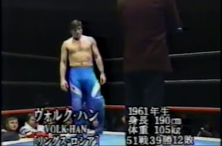 MEGA BATTLE TOURNAMENT 1996: GRAND FINAL VOLK HAN VS. KIYOSHI TAMURA YAAAAHHHHH our video begins with both græppzmen already in the ring but one can surely imagine the fervor of those assembled in 日本武道館 Nippon Budōkan as the demonstrably sikk entrance themes of each resounded throughout its whole deal. There is a good amount of TAMURAAAAA being yelled as instructions are received from the kind of iconic Yuji Shimada (iconic to me, to my friends, to some other people probably). Volk Han begins by whipping Tamura around with a wrist-lock to allay any concerns we may have had that this will be shooting and people could be shoot-hurt on shoot-purpose in any of this. He throws, Han does, from a gyaku-ude-garam/figure-four arm-lock and then we are off the to the races in Tamura/Han shoot-style ne-waza, which is to say holds (gatame) are exchanged at a pace that is unreal (in both the literal and superlative senses and actually I suppose in a pejorative sense too, all at once): juji-gatame, ude-garami arm entanglements, ashi-kansetsu (leg-bone-lockings) of wide array. When Tamura takes the back and the pace slows, it is only for an instant, as the two roll to the ropes together and are restarted. When Han catches Tamura's leg, his kicky kicking leg, Tamura flips out of it in a kicking way, and the crowd is like WHOOOAHHHH and I am mostly noticing the pretty enormous size difference between these two: Han is in with truly huge people so often (Bitsadze Tariel, Hans Nijman [R.I.P.], etc.) that one can easily lose sight of his sheer wolfish length, or at least I can. AHHHHH I thought that was going to be it, Tamura had Han fully extended on a juji-gatame (and yet not hyper-extended, as he had Yamamoto in their [apparently shoot?] semi-final) with Han seemingly too far from the ropes to do anything about it but, again, this (wolf)man is a long one. Han's approach to gyaku-ude-garami (reverse arm-entanglement) is totally instructive, by the way, even if this is shoot-style (which it is for sure) and not shooting proper (it is definitely not) in that while it is of course mighty as a kansetsu-waza (bone-locking-technique) in and of itself, it is also enormously (and maybe more?) useful as a way to grip, to sweep, to juji-gatame. This is a super match and they are going like hekk, both of them, but if I may observe what is to me a minor limitation, it is that the drama of the rope breaks is too dramatic: there is too much hauling of each other towards the ropes for the break whist the hold is already applied to the point of apparent excruciation; to me this is not ideal, I guess? Ah but in the end there is none of that, and Volk Han emerges as your (my, our) MEGA BATTLE TOURNAMENT 1997 Champion by way of kata-ashi-hishigi (single-leg-crush):